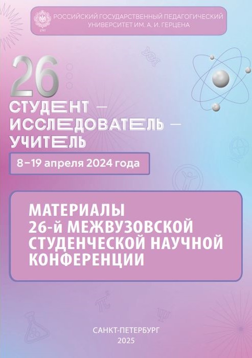 Студент - Исследователь - Учитель : тезисы докладов 26 Межвузовской студенческой научной конференции (Санкт-Петербург, 8-19 апреля 2024 года) / редакционная коллегия: Антонян К. Г., Верба Н. И., Волгина Е. А., Вологова Т. С., Гладкая И. В., Головацкая Т. П., Денисова А. А., Дондоков Д. Д., Жеребин А. И., Иванов Е. А., Исаева Е. И., Исакова Н. П., Калинина Е. Ю., Камалдинов А. В., Кондратьева С. Ю., Костейчук О. В., Макурова Д. А., Микляева А. В., Подольская К. С., Рогозина Т. В., Рогушина Л. Г., Соколова Н. В., Спицына Т. А., Устюгова Т. А., Шихирина К. А., Якубсон М. Я. ; Российский государственный педагогический университет им. А. И. Герцена. —