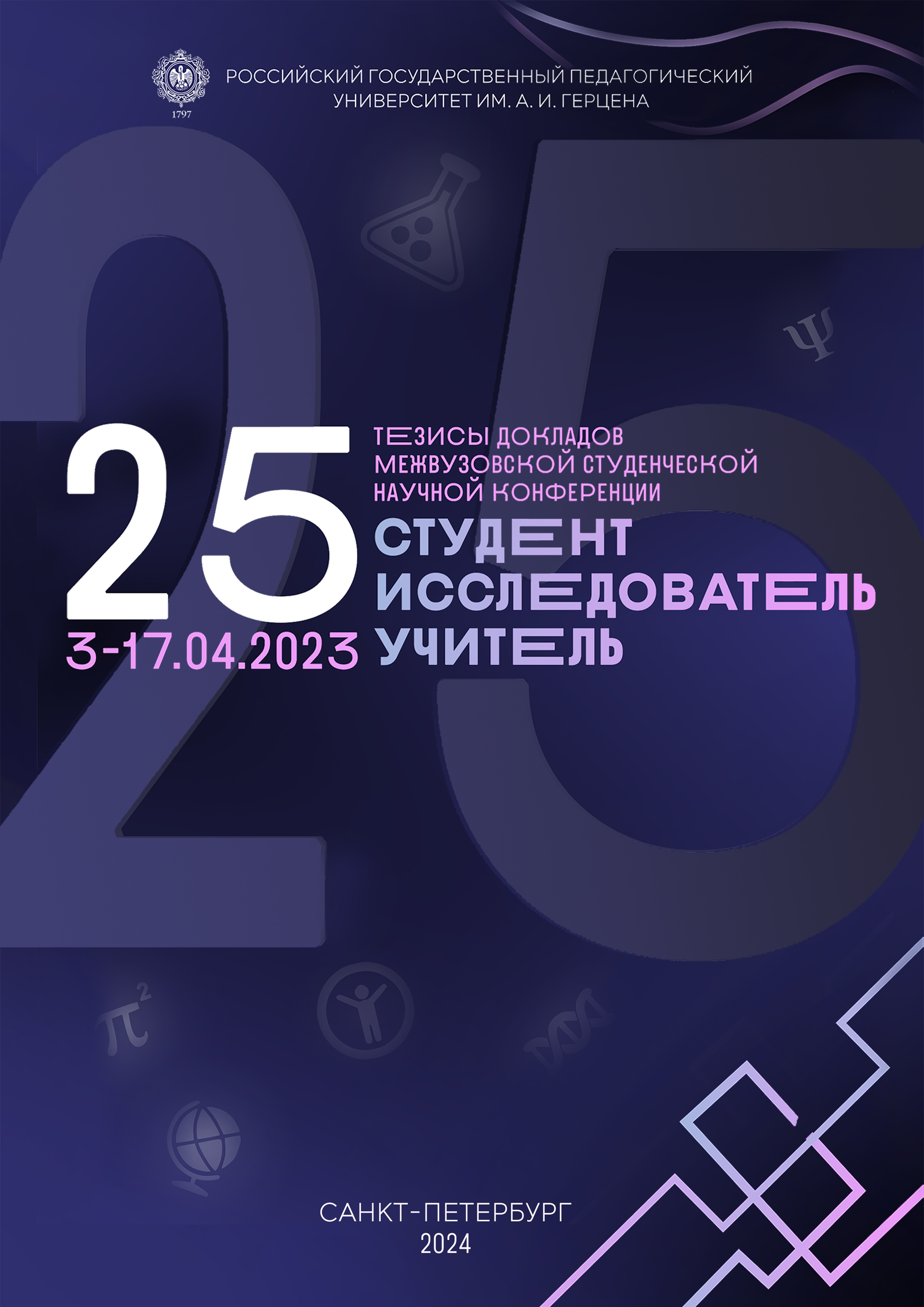 Студент - Исследователь - Учитель : тезисы докладов 25 Межвузовской студенческой научной конференции (Санкт-Петербург, 3-17 апреля 2023 года) / редакционная коллегия: Антонян К. Г., Бавина П. А., Бочарова Н. А., Верба Н. И., Вологова Т. С., Галактионова Л. Н., Гладкая И. В., Головацкая Т. П., Гулякова А. А., Денисова А. А., Дондоков Д. Д., Дымарский М. Я., Исаева Е. И., Калинина Е. Ю., Козина Н. Д., Костов Ф. Ф., Кублицкий Ю. А., Лебедев В. Н., Медникова Л. С., Микляева А. В., Моторов Д. А., Николаев А. Б., Николаев Е. И., Подольская К. С., Соколова Н. В., Спицына Т. А., Урсул Н. В., Устюгова Т. А., Чурилина И. Н., Эмануэль Т. С., Якубсон М. Я. ; Российский государственный педагогический университет им. А. И. Герцена. —